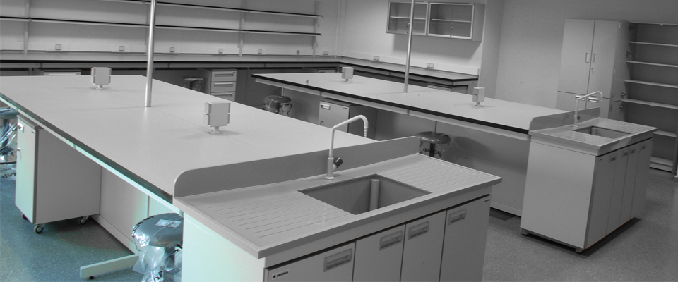 Mobiliario de laboratorio adaptado a la norma UNE-EN-13150:2001, formado por elementos estructurales fabricados en perfil de acero, laminados y tratados con pinturas epoxídicas anticorrosivas, módulos con rodapié, fijos o móviles, suspendidos-desplazables, cajones amortiguados y silenciosos, puertas con apertura 270º con recuperación y amortiguación de golpe, servicios de sobremesa o en canaletas de servicios. Las encimeras pueden ser placas de gres vitrificado con reborde perimetral o tableros de resina sintética compactos.